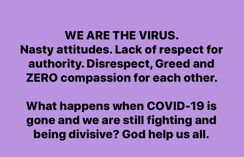 How did this world get so nasty? I’m not talking about the Coronavirus, but the people. Do you hear the tone of everyone talking? So mean. So unkind. No regard for one another. Let’s just admit it. This proves that long before this virus we had our share of mental problems. We don’t think right and therefore we don’t talk right. In a day in time where people are panicking I post that everything is going to be alright and people who claim to know God are upset about that? WOW! What happen to us as a people? We have lost it and this is not about the virus. This is about us. We don’t care about each other anymore. The emotional pain and meanness you hear people spewing out of their mouths make me sad. People don’t respect marriage these days. They don’t respect family. They don’t respect community. Where is the love? Where’s the compassion and concern for others? Neighbors don’t speak to each other. Families meddle in the affairs of people they act as if they own. This world was contagious long before the Coronavirus.